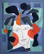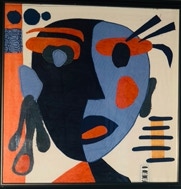 Tête orange et violette sur fond taupe